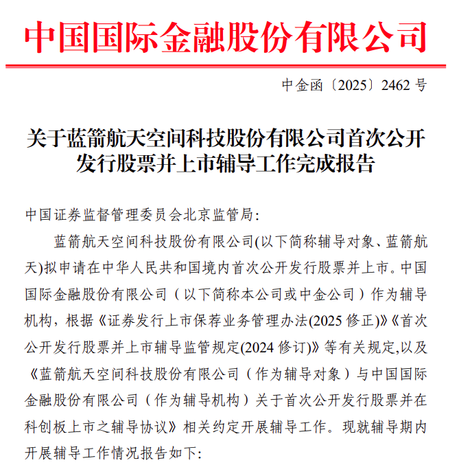 据中国证券监督管理委员会网上办事服务平台披露,近日,蓝箭航天空间科技股份有限公司(下称蓝箭航天)IPO辅导工作正式完成,辅导机构为中国国际金融股份有限公司(下称中金公司)。